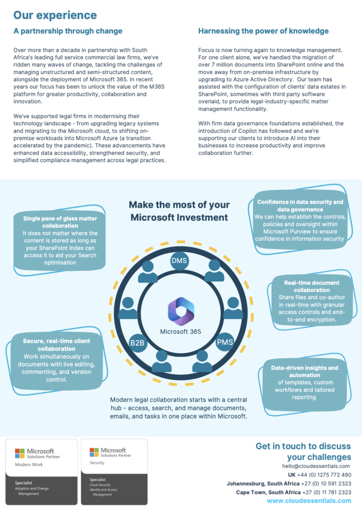 By consolidating your legal content in Microsoft’s ecosystem, you create the foundation to leverage generative AI tools that can be securely and responsibly deployed. With matters, documents and institutional knowledge in one place, your team can ask better questions, quickly find answers and unlock insights, knowing that data is protected within Microsoft’s compliance and security framework.